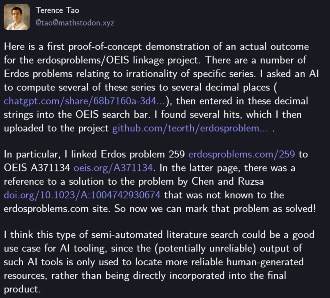 他借助GPT-5对相关数列进行高精度计算,随后将得到的结果输入OEIS(一个收录全球数列的数据库)进行检索对照,进而发现部分Erdős问题其实早已在既有研究中被解决——只是长期没人注意到,未把结果与问题库对应起来。