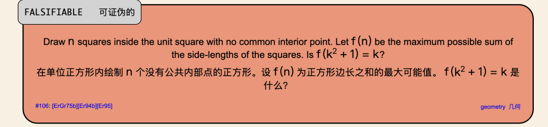 根据Erdős#106,他将f(n)引入该问题,设定其为最小数,使得把n个正方形按平行坐标轴打包进一个大正方形时,满足: