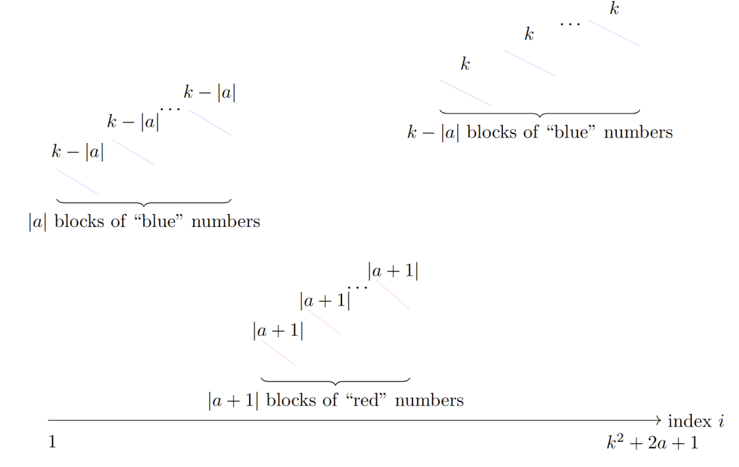 该上界通过构造不利配置的序列实现,基本思想仍然来自Erdős–Szekeres定理,即复杂设计数字排列顺序,会使得长单调序列无法同时拥有很好的权重。