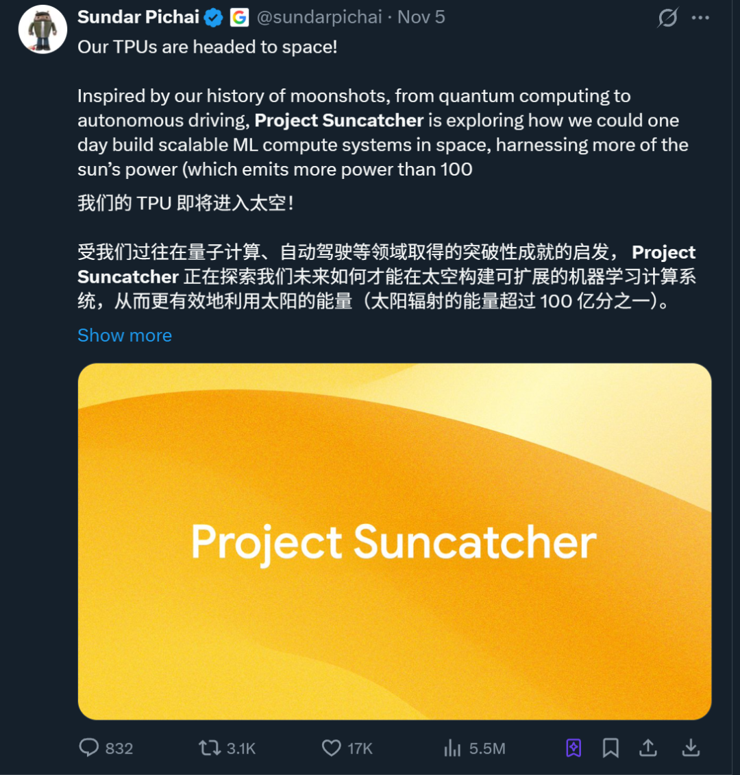 此外,谷歌也正在积极推进一项名为“Project Suncatcher”的计划。