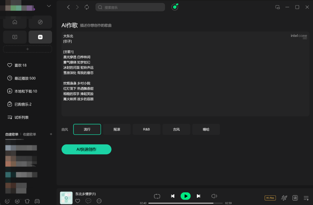 然后我们只需要把关于歌曲的灵感直接输入进去,选择“流行”的曲风,最后点击“AI快速创作”就好了。