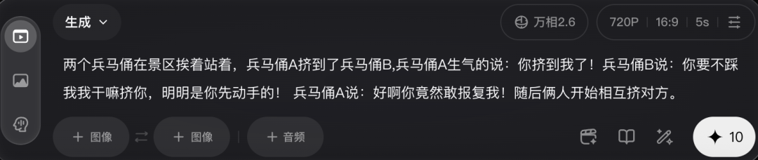 咱们再来试试声画同步能力,最近二创兵马俑的AI玩法视频超级火,咱这次直接给万相2.6上点难度,让它roll一段双人剧情演绎的兵马俑对话小视频,看看效果咋样!