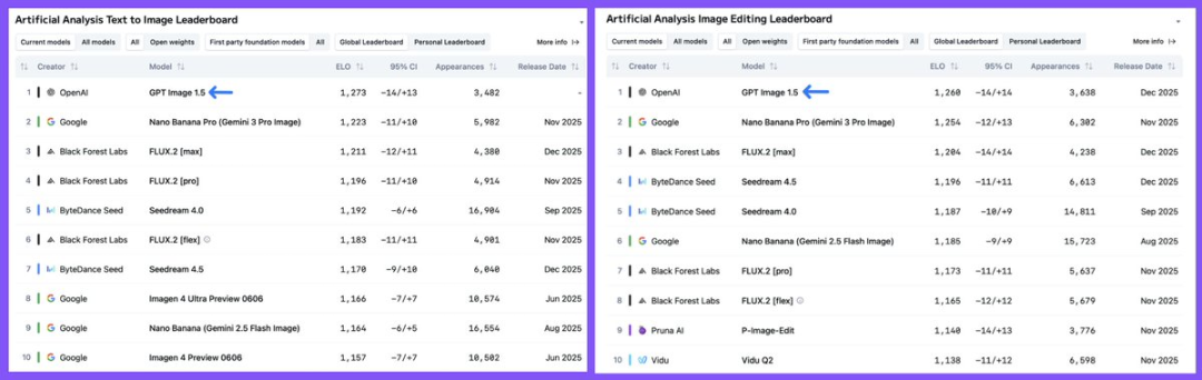 评测机构Artificial Analysis指出,GPT-Image-1.5在文本转图像和图像编辑方面中均位列第一,超过Nano Banana Pro。