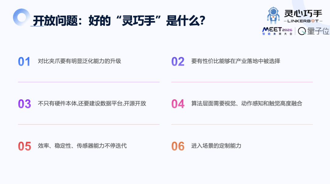 第二,灵巧手到底能不能被更广泛的场景应用,将来会不会更灵巧,有更多生态上各种各样的算法,最关键的话有多少客户,其性价比方面目前已经到了进入各个场景的水平。