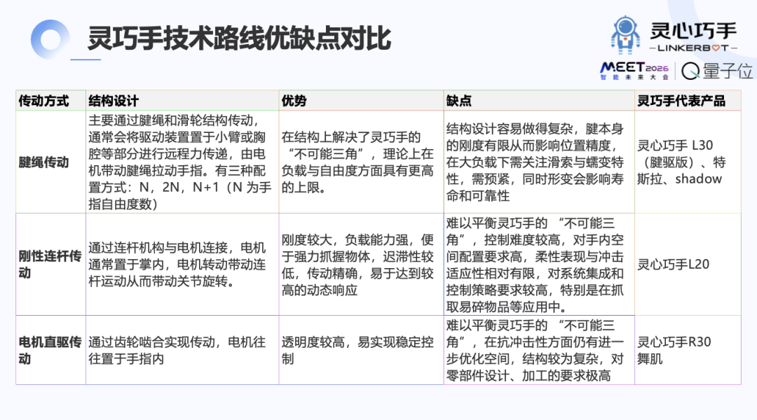 当前全球灵巧手有三种主流技术路线:腱绳传动方案、刚性连杆传动、电机直驱传动。灵心巧手在这三个方向都有对应的解决方案。