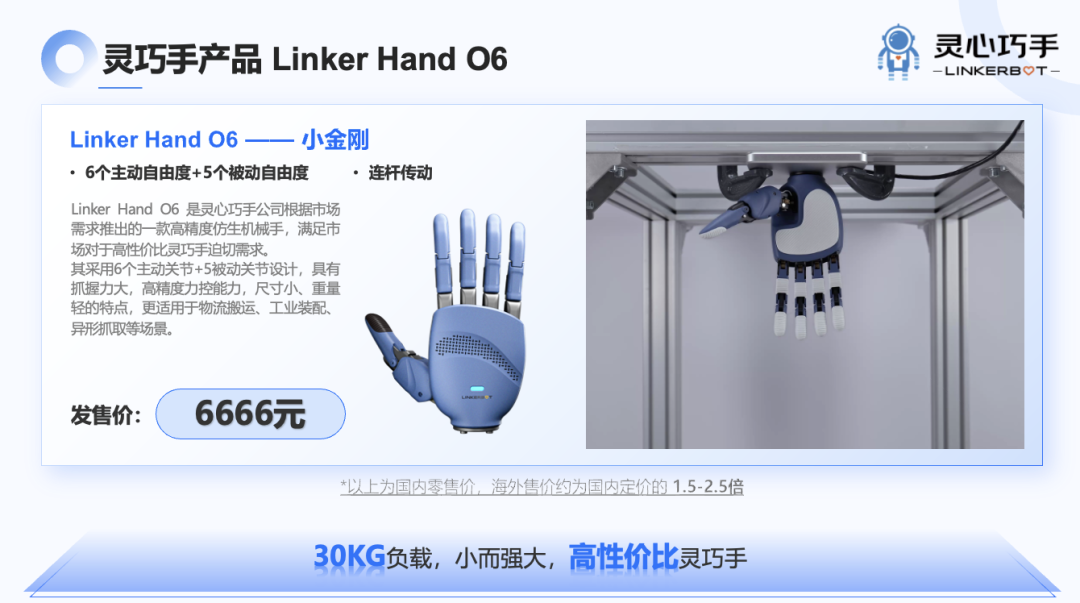 Linker Hand O6这款手也是做灵巧手的场景。这个手整个手370克,目前全球最轻的一款灵巧手,它虽然很轻,单手指捏力3公斤,基本上跟一个女孩力量一模一样,整个负载是30公斤,可能比很多女孩更有力量。