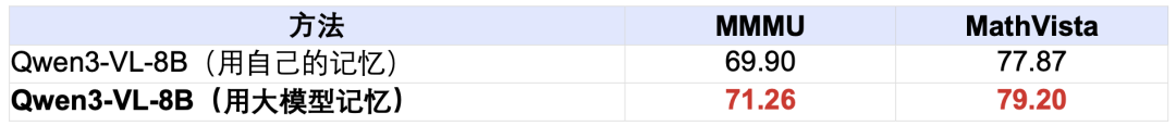 作者还做了一个有意思的“跨模型记忆迁移”实验——让大模型“带小弟刷分”,也就是小模型直接使用大模型生成的记忆,看分数会发生什么变化。