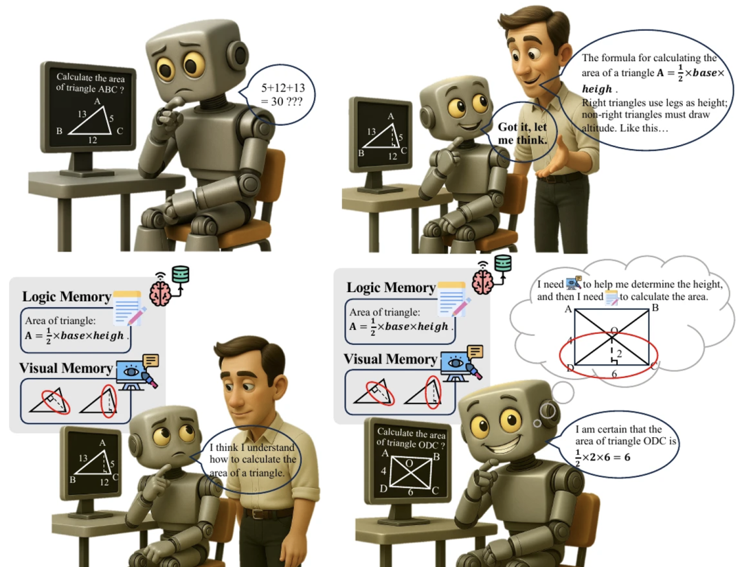 认知科学研究表明,人类的语义记忆天生就是多模态整合的,既会记住“这道题要用勾股定理”(逻辑规则),也会记 “这个角看着像直角其实不是”(视觉经验)。