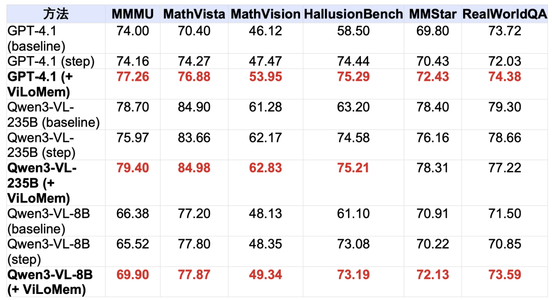 在不改动大模型参数的前提下,ViLoMem能在多个多模态基准上稳定拉升表现,尤其是在需要精细视觉理解的数学与真实场景推理任务上,为构建真正“会从经验中长记性”的多模态智能体提供了一条很有潜力的道路。