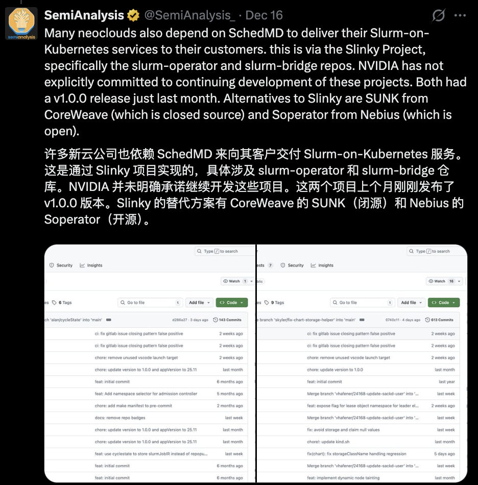 但外界的担忧却没有消散,有人注意到,支撑不少新云厂商提供Slurm-on-Kubernetes服务的Slinky项目,涉及到slurm-operator、slurm-bridge等关键仓库,英伟达并未明确表态会持续投入开发。