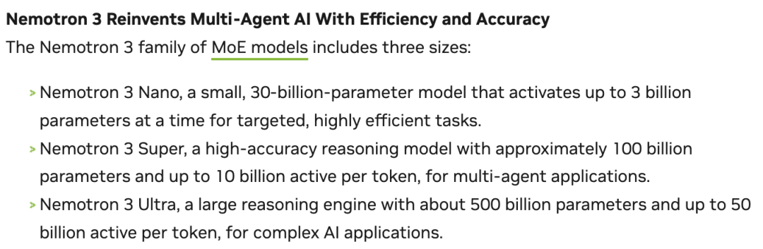 英伟达还推出了最新的Nemotron 3系列开源模型,模型采用MoE架构,支持百万token上下文窗口。