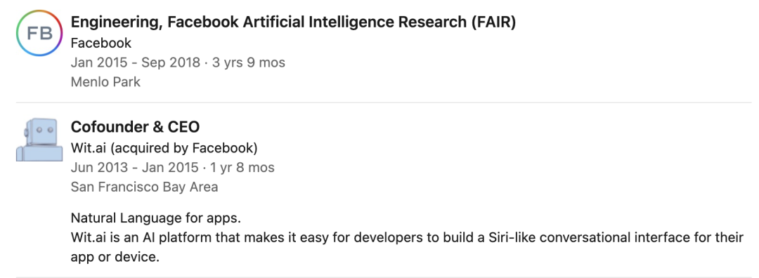 而他与LeCun的交集,则始于2015年的一次关键并购——当时他创立的语音交互平台Wit.ai被Facebook高价收购,他也随之正式加入了Meta的技术生态。