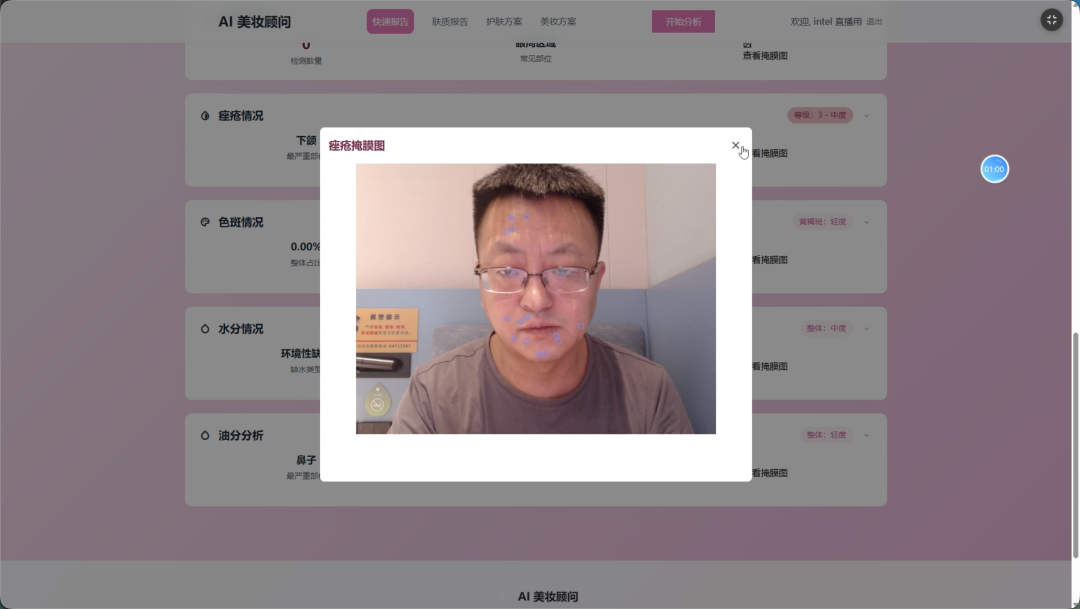 并且点击查看掩膜图,还会弹出一张标出具体皮肤问题位置的照片,例如痤疮就出现在下图中蓝圈的地方: