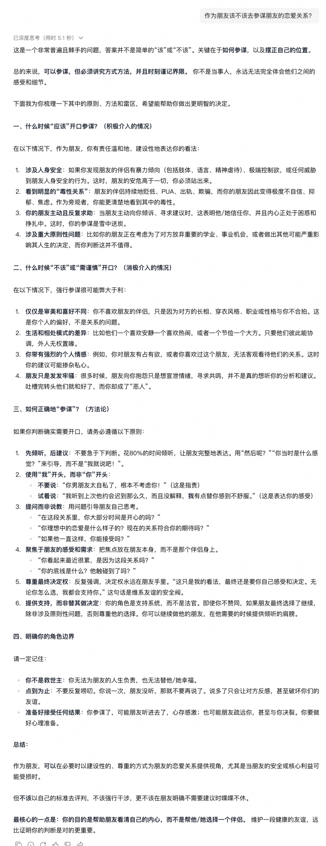 有时候,我们面临的情感难题,MiMo-V2-Flash也可以给出建议,比如作为朋友该不该去参谋朋友的恋爱关系。