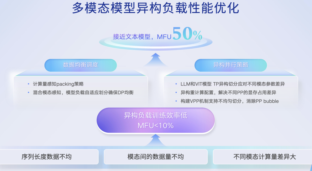 多模态模型则带来另一类问题,不同的模态会带来不同的训练强度,不同模态的计算,还用原来的同构拆分方法的话会导致训练的效率非常低,典型情况下MFU可能都不到10%。