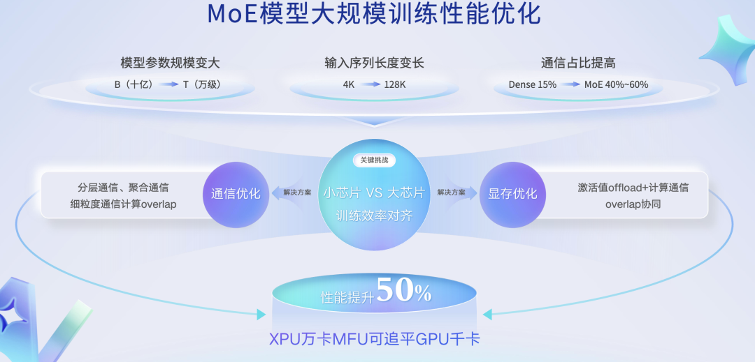 当前重要发展方向是MoE,它在某种程度上延续了原有的Scaling Law,能够继续扩大参数规模,同时不增加激活参数规模。但系统层面会面临新的挑战:模型参数变得更大、输入序列变长,通信占比显著提升,占比提升意味着整个模型架构都要有变化。