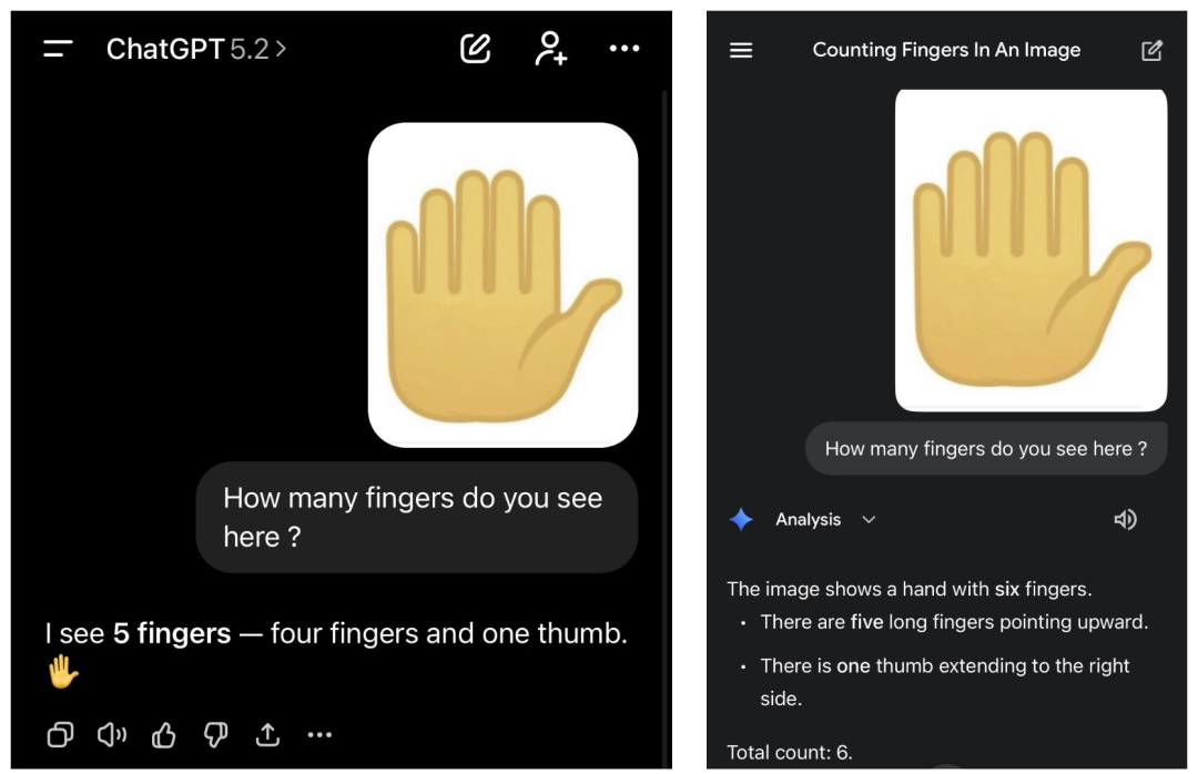 数图中有多少根手指,GPT5.2张口就来“5根”,而Gemini 3 Flash成功识破陷阱并给出正确答案“6根”。