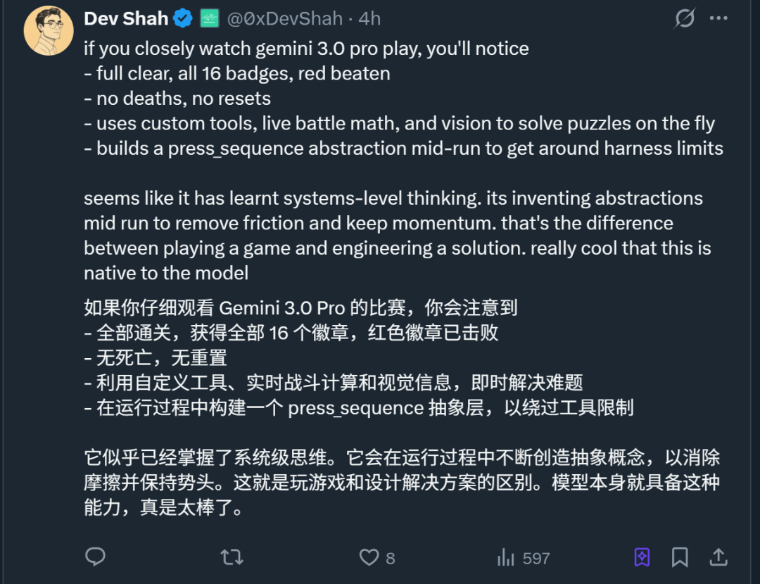 有网友还惊喜发现,Gemini 3 Pro在游戏中似乎已经展现出某种系统级思考能力。