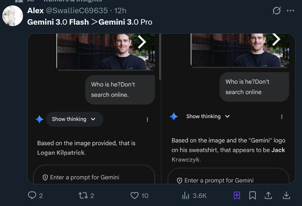 Gemini 3 Flash率先答对,而Gemini 3 Pro将他误认为Gemini前负责人Jack Krawczyk(已于今年4月离职并转投Meta)。