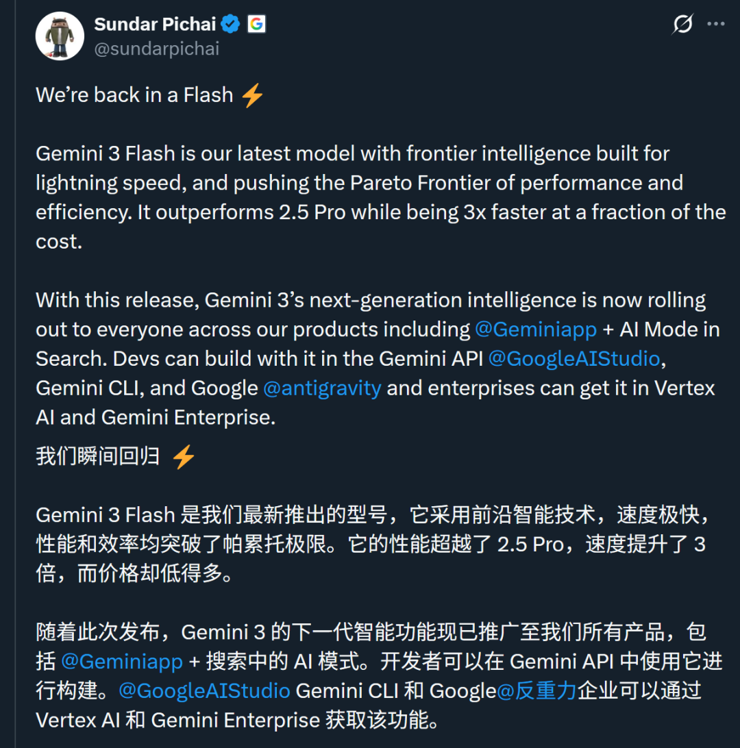 一个公式来形容这款新模型:Gemini 3 Flash=Pro级智能+Flash级速度+更低价格。