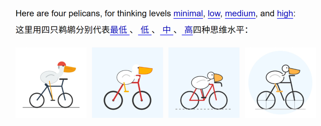画一张骑车的鹈鹕,Gemini 3 Flash(右上)的表现明显优于Gemini 2.5 Pro(左)和Gemini 3 Pro(右下),而且这些还都是反复测试后抽取的最佳结果。