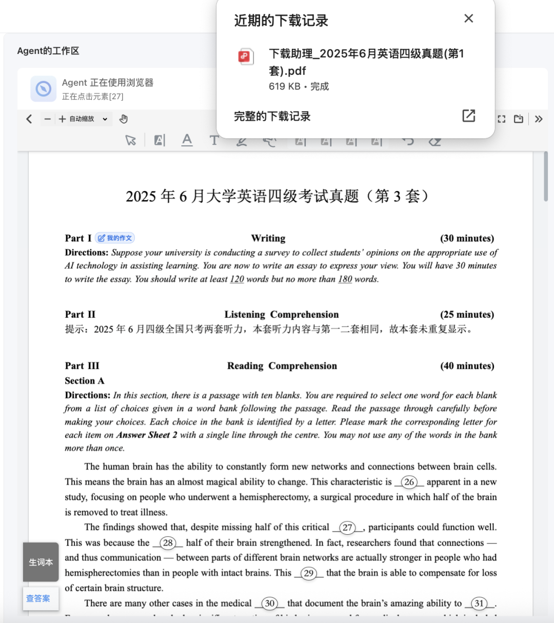 这回我交代给AI的任务是,让它帮我全网搜索并下载25年大学英语四级考试真题,大概用时1分钟左右的时间,AI就帮我在本地下载好了一份pdf真题文档: