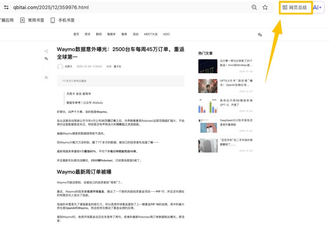 例如,我点开一篇资讯文章,AI会自动识别当前为阅读场景,并自动弹出「网页总结」功能,把我手动调出功能栏的时间都省了,属实是预判我的预判了: