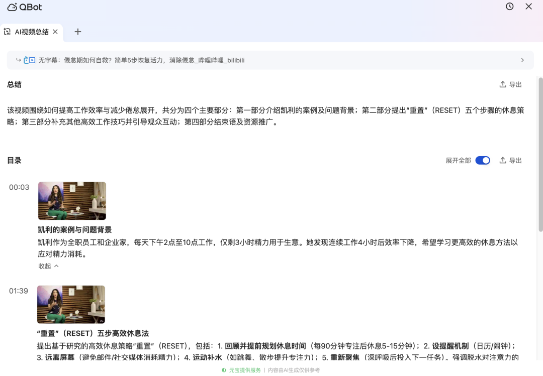 此外,长视频的浏览困扰也被补上了,有些视频动辄几十分钟,信息密度高、结构还不清晰,看着看着头就大了。