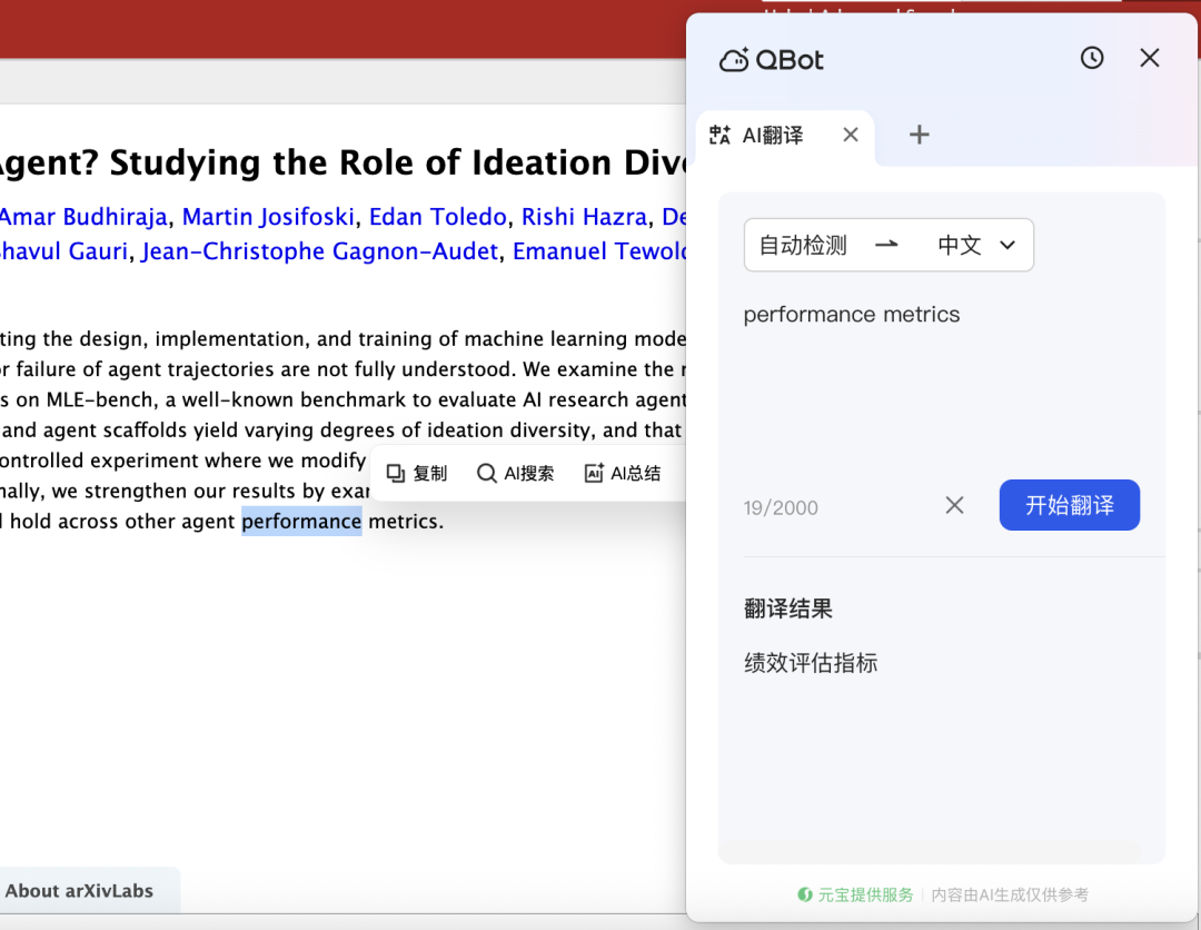好巧不巧,这个问题QQ浏览器也想到了,AI+小窗的「网页翻译」可以直接把网页中的英文秒变中文,我随手拿篇arxiv论文试了试,一键翻全篇,比我们自己逐句啃单词轻松太多了…