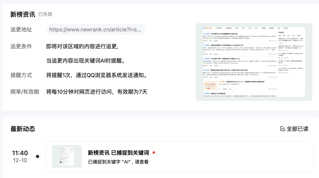 方法也很简单:把网页链接丢给AI更新助理,框选想留意更新的位置,再设个提醒频率和更新时间,之后的资讯更新就全交给它了,我就可以腾出精力做别的事情: