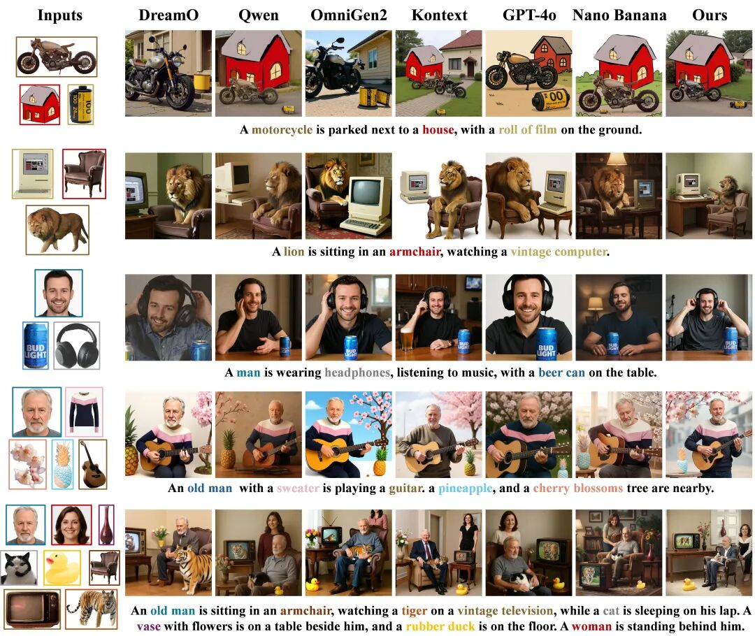 值得一提的是,在基准测试中,ContextGen在多主体任务中的身份保持能力,甚至相较于GPT-4o、Nano Banana这样的闭源模型仍保持显著优势。