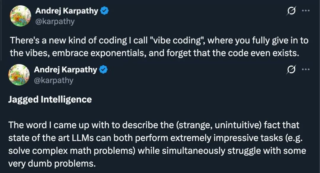 有意思的是,氛围编程和前面提及的锯齿智能都是由卡帕西命名的,但彼时的他还并未料到,这两个词会成为2025年AI发展的最佳注解。