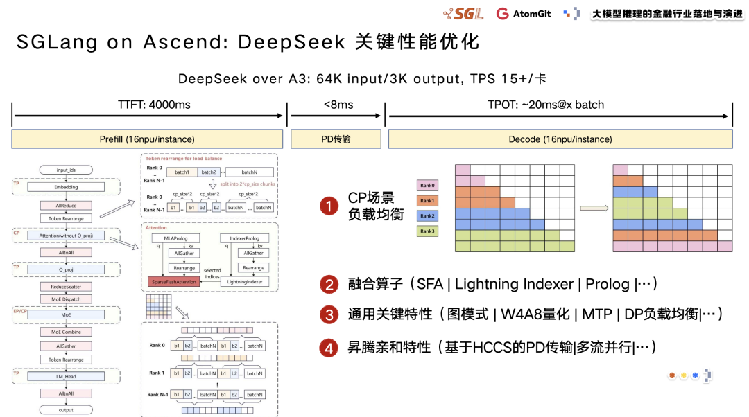 缓存与通信则依托HiCache完成L1/L2及L3-L1直通优化,最底层的SGL-kernel-NPU则承载昇腾加速算子、量化算子及传输接口,实现开源能力与昇腾性能的双向赋能。