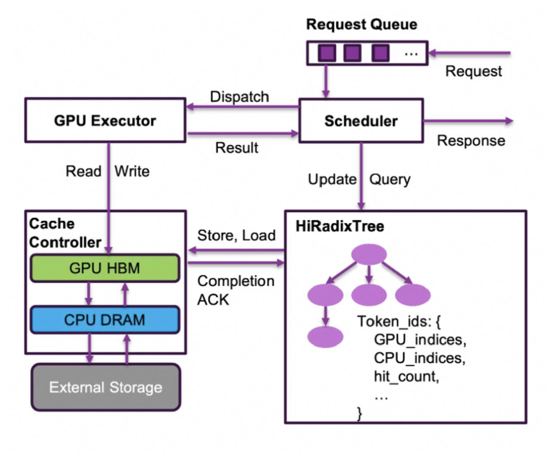 SGlang通过最新引入的HiCache体系,将KV cache扩展到CPU和远端存储,由Cache Controller自动管理KV卸载填装,并结合流水线化异步预取,显著降低了显存占用,提升了上下文推理的稳定性与吞吐。