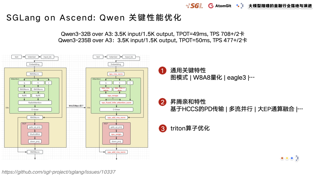 在上述共性问题之下,活动中也展示了SGLang在昇腾平台上的最新进展,覆盖模型适配、性能优化及系统加速能力模块化沉淀。