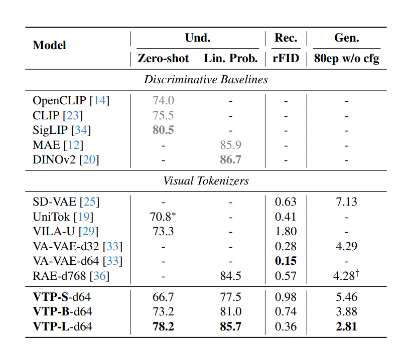 最终,VTP得到的不是一个在某个指标上“特别优秀”的压缩器,而是一个自带理解能力、对生成模型非常友好的视觉Tokenizer。