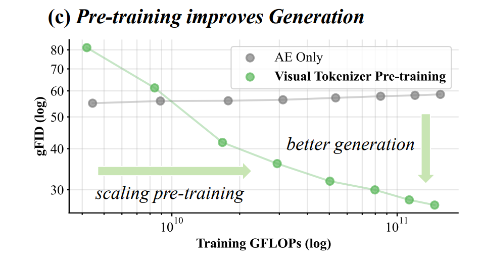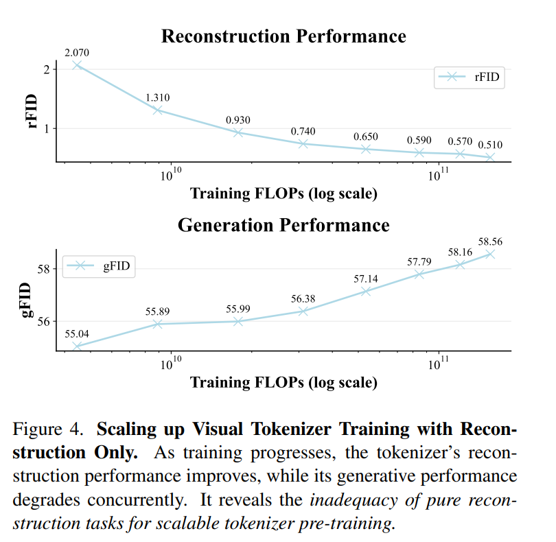 如图所示,传统仅基于“重建”目标训练的Tokenizer(灰线),随着算力投入增加,模型的生成性能不仅没有提升,反而逐渐趋于饱和甚至略微下降。(ps:gFID衡量生成质量,越小越好)