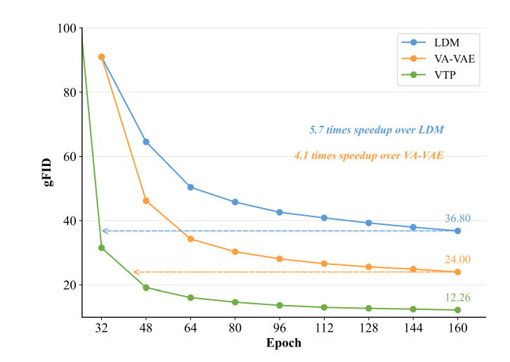 更关键的是,在达到相同生成质量的前提下,VTP的训练收敛速度比LDM快5.7倍、比VA-VAE快4.1倍,大幅降低了训练成本。
