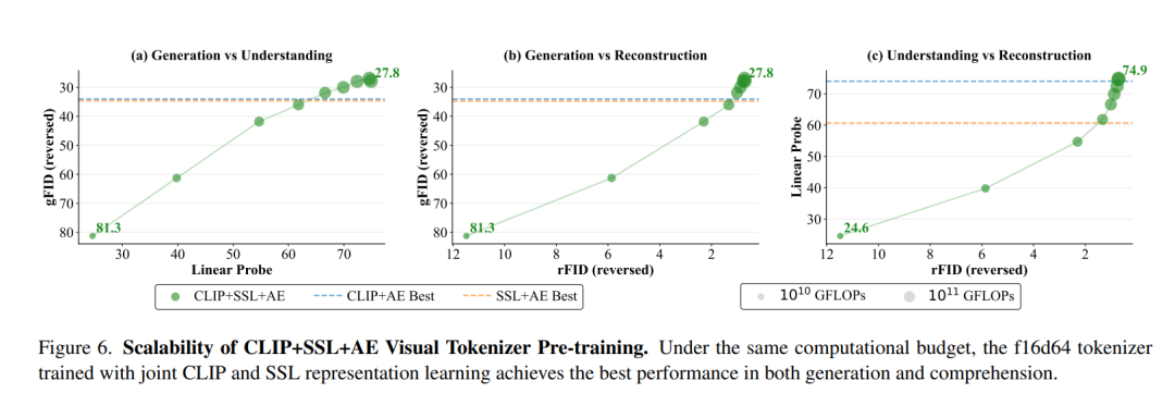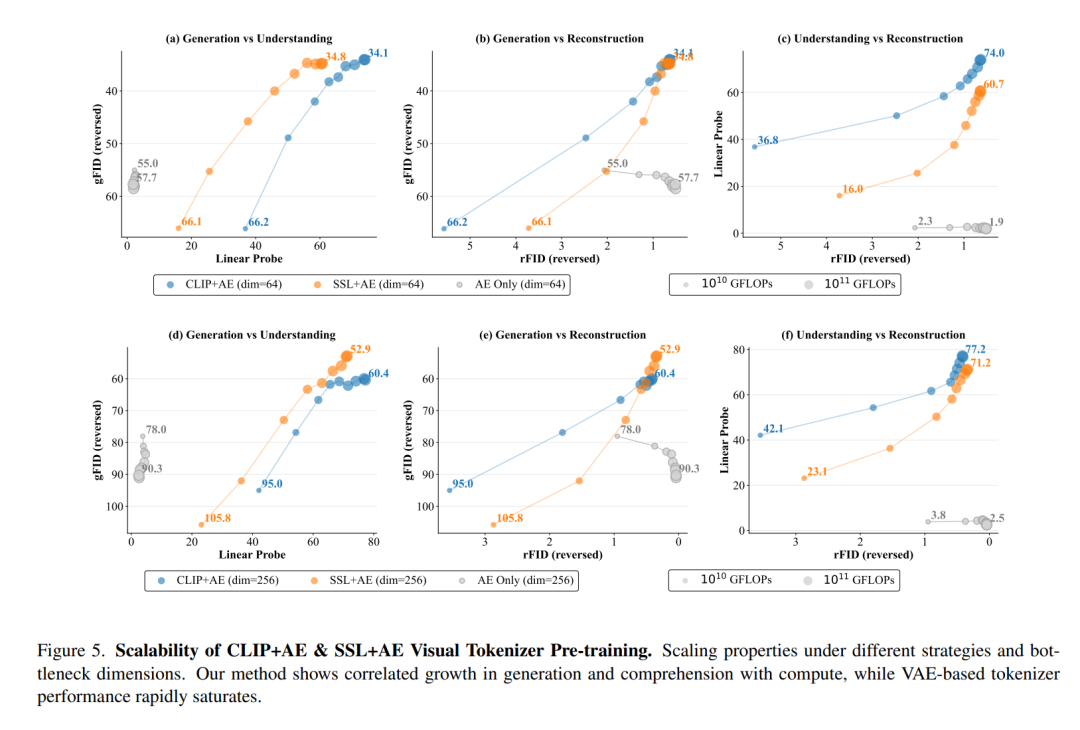 二者呈现明显的正相关,且这种提升会随着训练计算量增加持续推进。相比之下,缺少“理解力”的传统AE Only方案,其生成质量和理解能力很快陷入停滞。