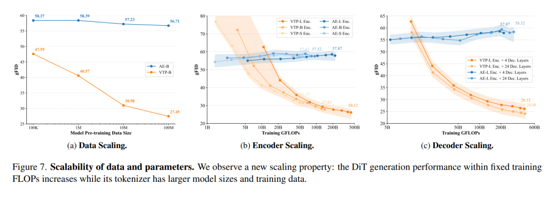 团队在实验中发现,VTP首次展示了Tokenizer的Scaling Law,即生成性能可以随预训练中投入的计算量、参数量和数据规模有效增长。