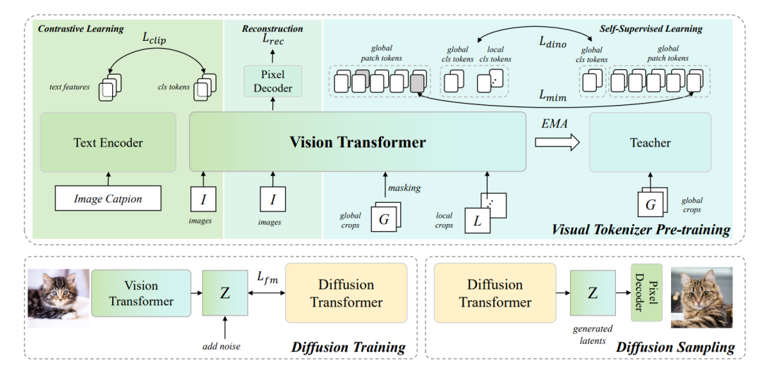 这和之前的CLIP思路一脉相承,但目标更聚焦。CLIP追求的是广义的图文匹配能力,而VTP则要求Tokenizer在压缩图像为紧凑的潜在编码时,必须保留与文本对齐的语义结构。