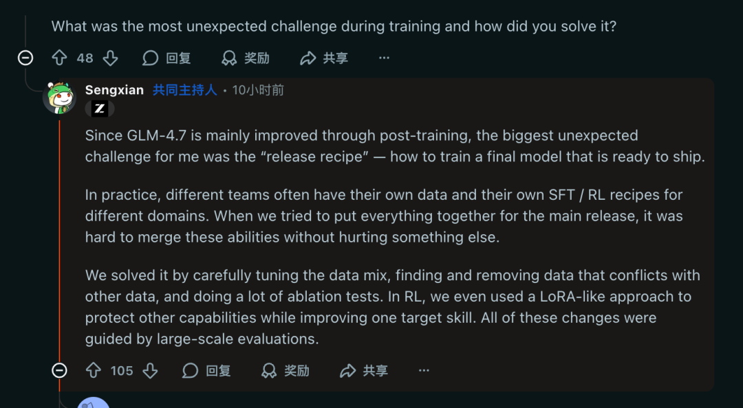 智谱团队在AMA中明确表示,GLM-4.7的改进主要集中在后训练阶段。