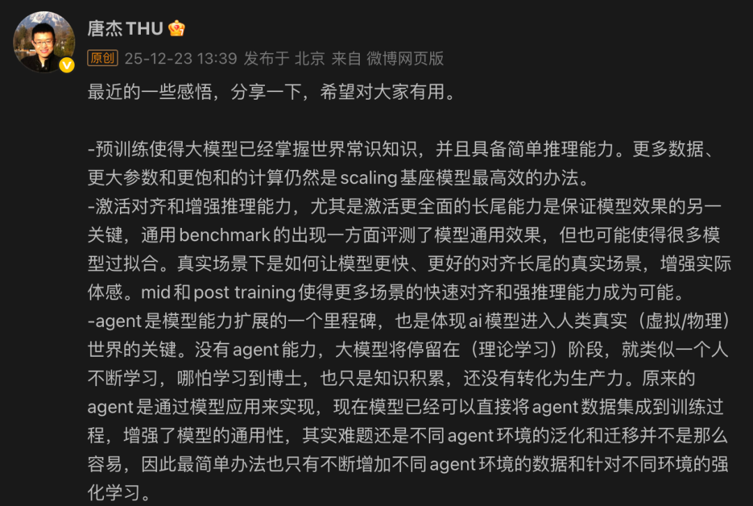 在此基础之上,智谱首席科学家唐杰在GLM-4.7发布之际发表了他对于大模型发展的一些观点。