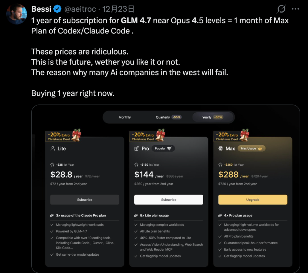 GLM 4.7的1年订阅(接近Opus 4.5级别)= Codex/Claude Code的1个月Max Plan。