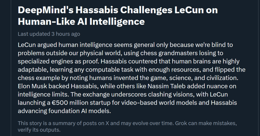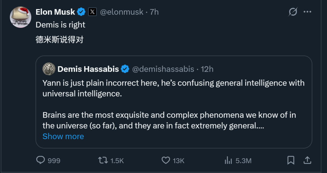 当然,马斯克的站队可能也有别的原因。毕竟他和LeCun素来不是很对付,跟哈萨比斯则亦师亦友——马斯克还是哈萨比斯DeepMind早期投资人。