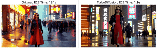 算下来,相对于原始模型,TurboDiffusion实现了约97倍的加速!