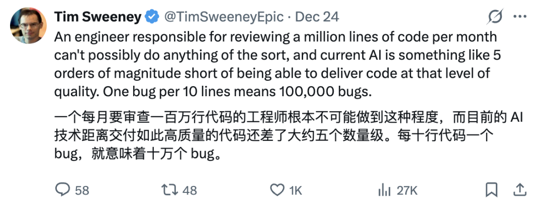 目前的AI技术距离交付如此高质量的代码还差了大约五个数量级,每十行代码一个bug。如果写一百万行代码,就意味着十万个bug。