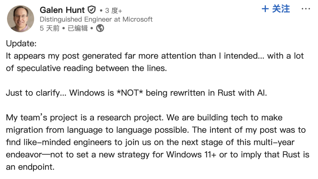 毕竟,当微软杰出工程师,Azure Sphere(微软IoT平台)领导者——Galen Hunt,开始公开使用「淘汰C/C++」「用AI重写代码库」等大胆字眼时,很难让人不怀疑这是微软内部已达成的某种共识。