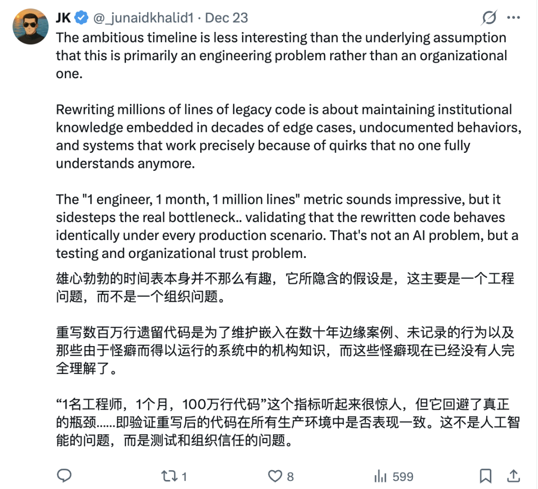 如果AI这个中间层,能够承接并消化上述转换成本,那么无论是微软,还是Windows开发者,掉头的阻力都会被大大削弱。这或许正是Galen提出「一名工程师,一个月,一百万行代码」的背后洞察。
