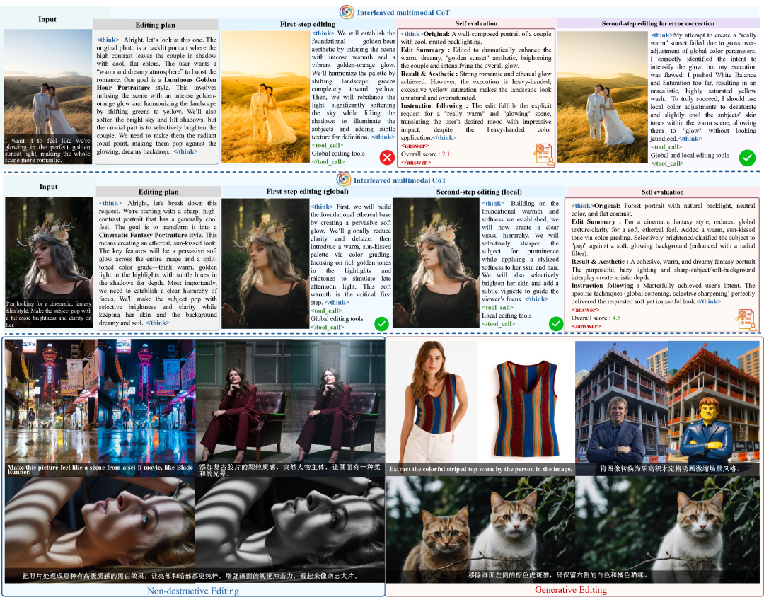 1、视觉感知与规划 (Perception&Planning):模型首先分析原图(I)与用户指令(Q),生成初始的修图思路。